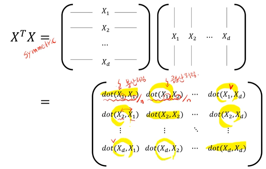 -> 두 매트릭스 곱해주면 분산, 공분산으로 이루어진 symmatric matrix가 만들어지게 됨