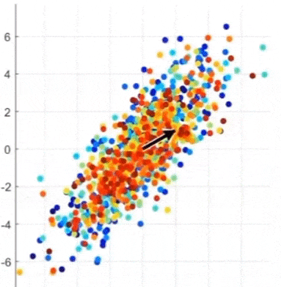- 2차원 평면 상의 산점도를 1차원에 정사영시켜 차원을 감소 -> 어떤 벡터에 정사영시키는 것이 가장 좋을지 찾는 과정