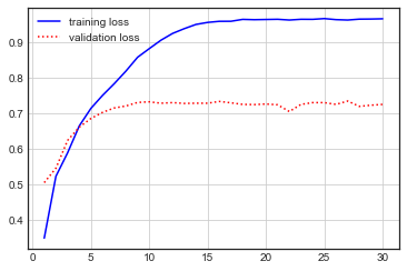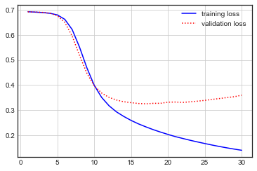 plt.plot(epochs, val_loss, 'r:', label = 'validation loss')
